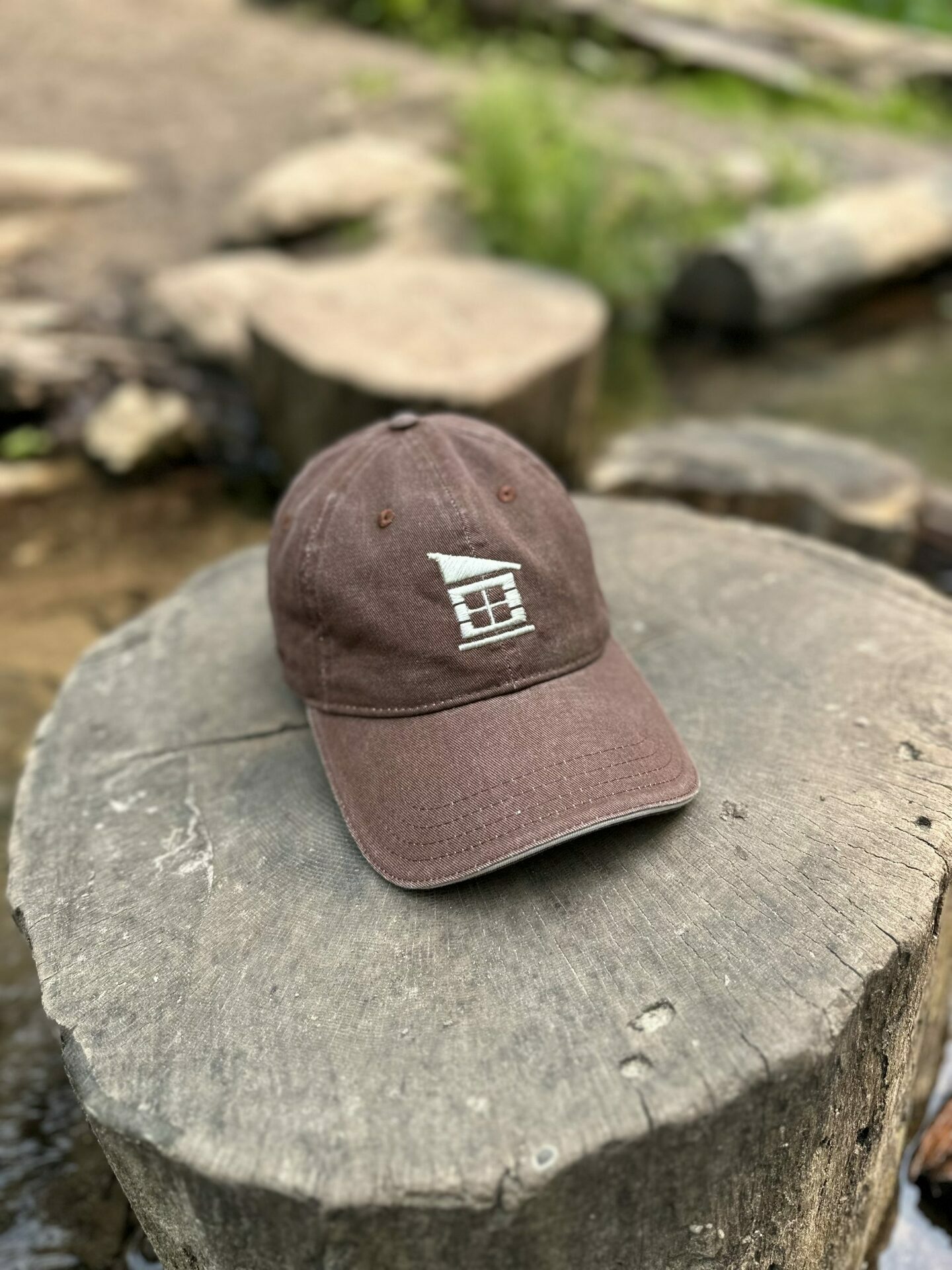 Fabric | Cotton, Vintage Dye for a “Distressed” Look, Thick Sandwich-Style Visor (cream), Adjustable with Metal Slider, Flat Embroidered CABINSCAPE Logo (front & side)