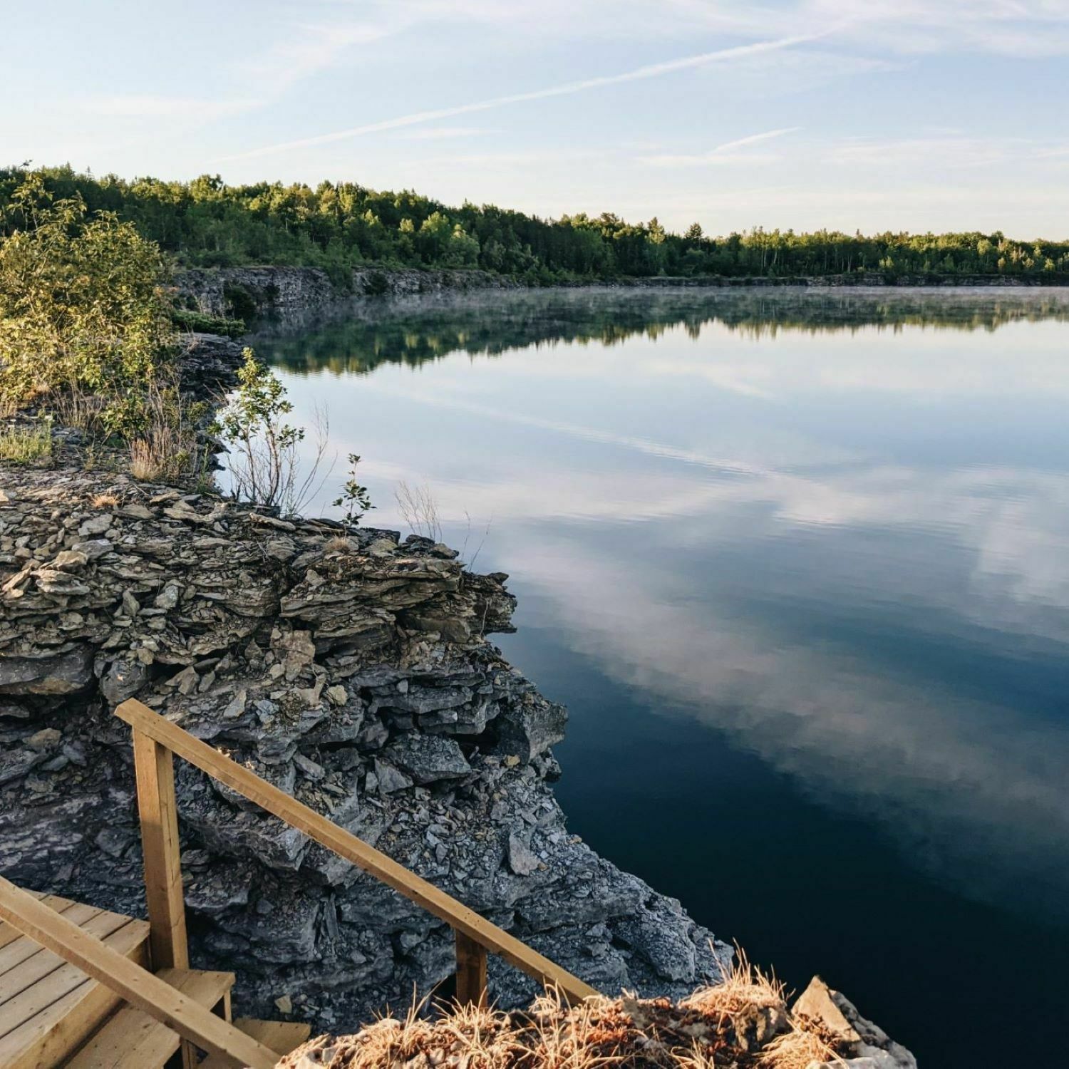 Perched on a stunning 230-acre property, Goldenrod Cabin overlooks a crystal-clear, spring-fed lake that was once a limestone quarry, offering an otherworldly escape just 1.5 hours from Toronto.
