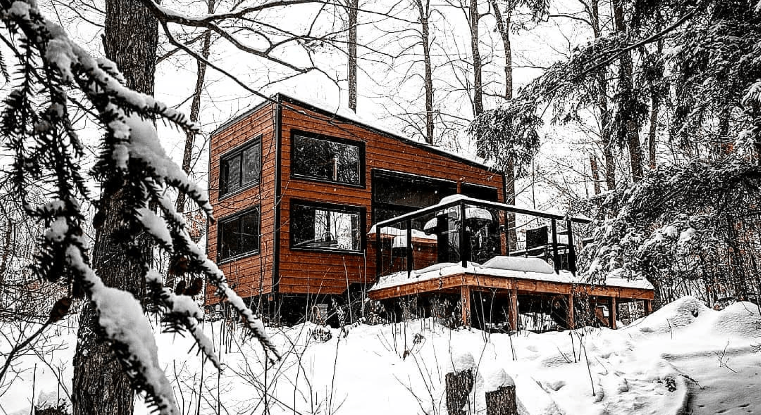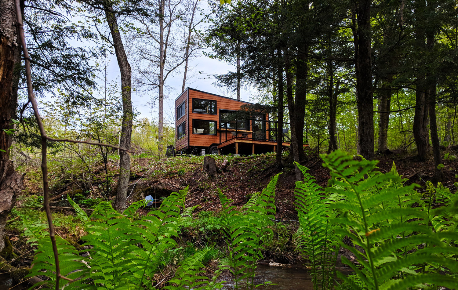 Named after iconic Canadian folk singer Joni Mitchell, this intimate wilderness retreat offers 77 wooded acres in Pakenham, a historic rural community on the edge of the Ottawa Valley. The cabin sits between a high valley ridge and a quiet forest, perched above a bubbling brook, creating a tranquil spot to recharge.